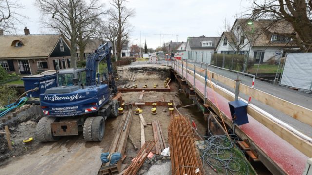 Aalsmeer – Op dit moment wordt er gewerkt aan de Aardbeienbrug en de brug bij de Kerkweg. Begin dit jaar is er vertraging opgelopen doordat de ligging van diverse kabels en leidingen en het persriool niet zeker waren. Om te zorgen dat, tijdens het boren van de palen, het riool niet voor overlast bij de bewoners van de Uiterweg zou zorgen is een bypass riool aangelegd en een nieuw ‘palenplan’ gemaakt. Inmiddels zijn de palen geboord en de werkzaamheden hervat. Er is helaas als gevolg van deze factoren wel een vertraging opgetreden. Aannemer Van Steenwijk heeft aangegeven dat de brug uiterlijk 1 juni 2020 helemaal klaar is met een mooie nieuwe hamei erop. Van 1 juni tot de bouwvak haalt de aannemer de omleidingsconstructie weg en brengt de aangrenzende percelen terug in de oorspronkelijke situatie. De planning is dat de vaarweg weer voor juli open is.