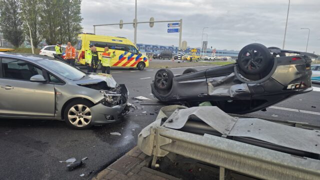 Aalsmeer – Op de kruising van de N201 met de N231 (Legmeerdijk) in Aalsmeer heeft woensdag 1 oktober rond kwart voor negen in de avond een ongeval plaatsgevonden. Meerdere auto’s raakten beschadigd en een auto belandde daarbij op zijn dak.