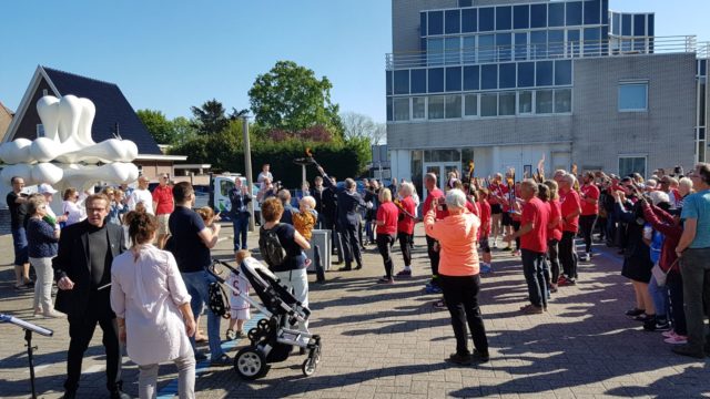 De deelnemers van deze Bevrijdingswandeling komen ongeveer tegelijk aan met de lopers die vanuit Wageningen het Bevrijdingsvuur meebrengen naar het gemeentehuis in Uithoorn.