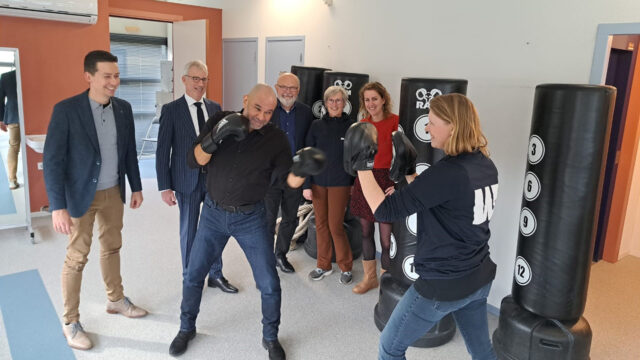 Wethouder De Robles test de bokstoestellen uit tijdens het collegebezoek aan Motion Fysiotherapie & Preventie. Foto: Gemeente Uithoorn.