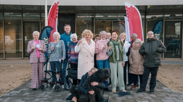 Aalsmeer – Alle 61 appartementen van het fraaie maanvormige gebouw aan de Roerdomplaan zijn opgeleverd en verhuurd. Reden voor een feestelijke bijeenkomst met de nieuwe bewoners en andere betrokkenen. Het gebouw heeft met zijn houten gevels en fraaie balkons een frisse en moderne uitstraling. De appartementen zijn een goede aanvulling op de Aalsmeerse woningvoorraad. Vooral om doorstroming op gang te brengen.