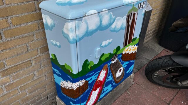 Extra leuk voor de jonge artiest ‘Dropzone’. Hij maakte een echte jongerenkast, vlakbij de Triade en het skatepark. Het leverde een fel gekleurde combinatie op van graffiti en skateboarding. ‘Aalsmeerse kunst langs de weg’, stond vorige week al in deze krant. De makers van de twee nieuwe kunstkasten op de Molenvlietweg waren nog niet bekend. Het blijkt om Engelien en Jakobien van der Weijden te gaan. Moeder en dochter hebben al eerder samen geschilderd. Deze keer hebben ze kenmerkende Aalsmeerse elementen in een creatieve blender gegooid en zijn aardbeien, de leeuw en de paling geschilderd. Omdat de twee kasten zo mooi naast elkaar staan waren ze ideaal voor twee gezellige schilderdagen. Pascal de la Haye maakte in augustus al de eerste kasten van dit jaar. Op verzoek van Hulleman Brood en Banket in de Ophelialaan maakte hij ook een creatieve variant op een ‘typisch Aalsmeers tafereel’: vijf smaken pramengebak varen naar de watertoren.