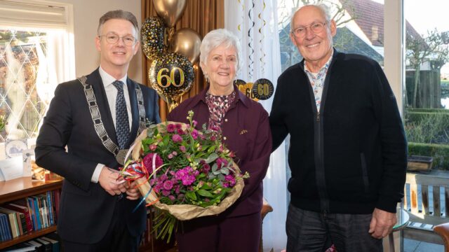 Kudelstaart – Het was een waar feest voor Piet en Annie Buskermolen-Rekelhof (beiden 86). Het Kudelstaartse echtpaar was maandag 12 januari 60 jaar getrouwd en vierde dat met vrienden, familie en buren in Dorpshuis ’t Podium Kudelstaart. Nog meer feestelijkheden afgelopen week want ook burgemeester Guido Oude Kotte kwam het jubilerende paar feliciteren. Dat gebeurde woensdag 14 januari. Hij nam een mooi boeket mee, vrijkaarten voor de Historische Tuin en een mooi boek over het Flower Art Museum. Twee bekende Aalsmeerse gelegenheden waar bloemen de hoofdrol spelen en dat is Piet Buskermolen niet vreemd, want hij was 40 jaar lang tuinbouwondernemer en had zijn eigen kwekerij aan de Mijnsherenweg. Rozen en later Cymbidium (orchideeën) waren de bloemen die hij teelde.