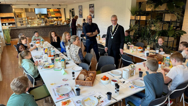 Uithoorn – Het jaarlijkse burgemeestersontbijt vond donderdag 9 oktober plaats in het gemeentehuis van Uithoorn. Dit keer schoven leerlingen van basisschool De Dolfijn aan in de kantine voor een gezond ontbijt met burgemeester Pieter Heiliegers en wethouder onderwijs José de Robles.