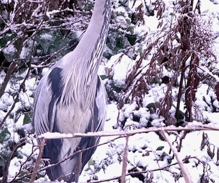 Als ik de ark binnenstap merk ik hoe koud ik het eigenlijk heb gekregen na het ‘rondje Poel’. Met de pelletkachel op stand vier ga ik, met een koud glas Pinot Grigio, naast de kachel met uitzicht op het zuidwesten zitten. Aan de andere kant van het raam, waar de sneeuw de oever en het rommelig geknakte riet wit bepareld heeft, landt de reiger. Zij loopt naar de boomstam half in het water en neemt een positie aan op één poot en kijkt mij aan: Hoe was jouw dag?