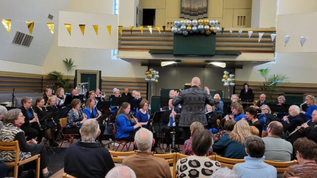 Halverwege het concert werd even stilgestaan bij een bijzondere mijlpaal. KLarinettiste Irene Teeuwen werd in het zonnetje gezet omdat zij maar liefst 25 jaar lid is van Aalsmeers Harmonie. Ze is een betrokken lid van het orkest, is jarenlang penningmeester geweest en helpt met allerlei hand- en spandiensten. Zij werd toegesproken door de voorzitter, kreeg een cadeautje en een groot applaus. Aan het einde van het programma werd nog een bijzonder moment gedeeld: het afscheid van Gerard Tesselaar, die op 88-jarige leeftijd stopt met spelen bij de harmonie. Bijna twintig jaar was Gerard een vaste waarde in de trom-bonesectie. Wat begon als een invalbeurt groeide uit tot een langdurig, actief lidmaatschap. Het concert werd afgesloten met de feestelijke mars Vivat Patria. Daarna werd het publiek uitgenodigd om in de Bindingzaal nog even na te praten, een drankje te drinken en natuurlijk de jubilaris te feliciteren. De ontspannen sfeer maakte de middag compleet: het was een geslaagd concert waar zowel publiek als muzikanten met plezier op terugkijken.