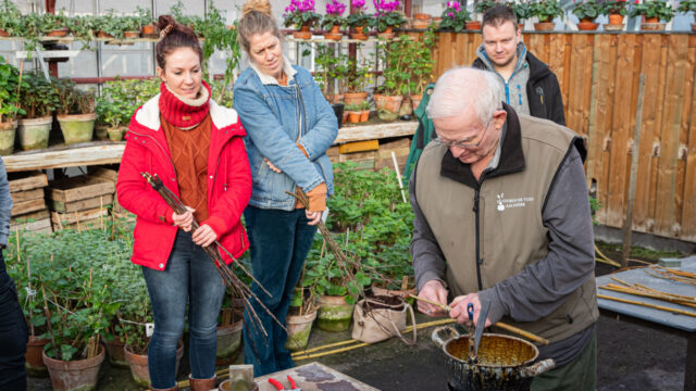 Aalsmeer – Afgelopen weekend vond de workshop fruitbomen enten plaats in de Historische Tuin. Elf enthousiaste deelnemers bekwaamden zich onder leiding van tuinmedewerker Gerben de Vries en tuinvrijwilliger Jan Maarsen in het enten, maar ook in het messen slijpen omdat scherpe messen vereist zijn voor het maken van de juiste inkepingen.