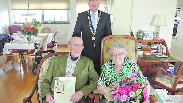 Aalsmeer – Afgelopen maandag 5 oktober was het bruidspaar Sparnaaij-Mantel precies zestig jaar getrouwd. Na een schriftelijke gelukwens van Zijne Majesteit de Koning werd er ook een bezoekje gebracht namens Gemeente Aalsmeer. Wethouder Ad Verburg kwam dinsdag met een prachtig boeket bloemen en een kopie van de trouwakte op visite bij het stel. De pers mocht daarbij aanwezig zijn. Meneer en mevrouw Sparnaaij kennen elkaar al bijna hun hele leven. Ze waren buurjongen en meisje, want woonden tegenover elkaar in de Weteringstraat. Til: “We deden samen altijd opzoekertje, knikkeren en bussietrap en in de pubertijd, we waren een jaar of vijftien, is bij ons de vonk overgeslagen. Tien jaar later trouwden we.” “Jongetje en meisje zijn we altijd gebleven hoor!” zegt Janus Sparnaaij opgewekt. Het stel is nog zeer helder van geest en met hun vijfentachtig behoorlijk fit. Meneer fietst nog altijd en mevrouw doet dat op de hometrainer. “Ik heb zeven maanden volledig plat gelegen in het ziekenhuis en ben sindsdien niet meer zo goed ter been helaas. Maar het gaat stapje voor stapje vooruit” Het paar kreeg vijf kinderen: Bernard, Meinske, Ans, Peter en ‘nakomertje’ Jan. Ze zijn, op Bernard na, allemaal aanwezig. Hij heeft het Locked in syndroom. Gelukkig kon hij er op de zestigjarige huwelijksdag wel bij zijn. “Dat was gisteren het mooiste cadeau dat we konden krijgen.” Aldus het bruidspaar. Naast vijf kinderen, kwamen er zeven kleinkinderen en er is één achterkleinkind. Nummer twee en drie zijn op komst en daar wordt met smart op gewacht. Er heerst een ontspannen, gezellige sfeer in huize Sparnaaij en er worden veel grapjes gemaakt. Het is duidelijk dat het een hecht gezin is. Mevrouw Sparnaaij: “We zijn heel tevreden. Iedereen is goed met elkaar. Ook de aanhang. Ja we hebben een mooi leven.”