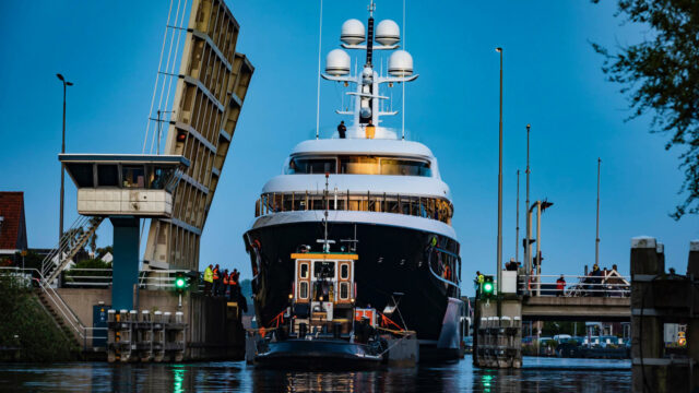 Aalsmeer – Het is nog vroeg en donker, maar bij Koninklijke De Vries Scheepsbouw Aalsmeer wordt al hard gewerkt. Maandag 18 mei is een bijzondere dag: Het jongste Feadship superjacht van Koninklijke De Vries begint aan de reis naar Rotterdam, waar ze klaar gemaakt wordt voor de proefvaarten. Langzaam worden de contouren van het indrukwekkende schip zichtbaar als de zon opkomt en dat leveren prachtig plaatjes op!