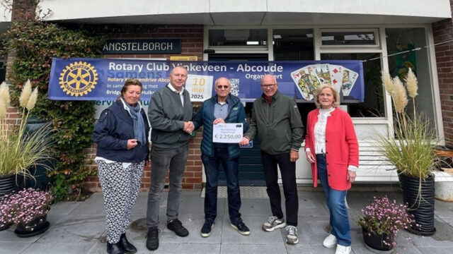 Abcoude/Baambrugge – Vertegenwoordigers van Stichting Angstelborgh ontvingen 8 oktober een cheque van 2.250 euro uit handen van de voorzitters van Rotaryclub Vinkeveen-Abcoude en Bridgeclub De Hulksbrug. De opbrengst is afkomstig van de tweede editie van de Kroegendrive, een jaarlijks bridgetoernooi dat in mei plaatsvond in diverse horecagelegenheden in Abcoude.