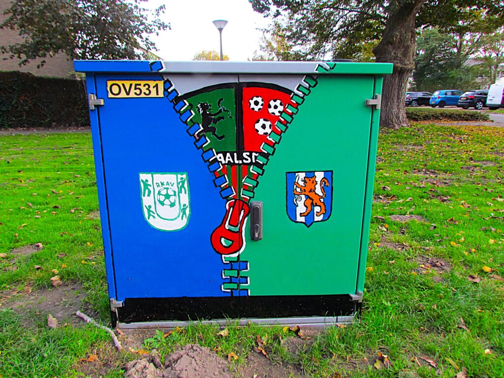 Richard Sluijs heeft tenslotte op de Beethovenlaan een sportieve ode gebracht aan FC Aalsmeer. Zijn eerste kunstkast verwijst naar de geschiedenis van de voetbalvelden die erachter liggen. In 2014 fuseerden VV Aalsmeer en RKAV Aalsmeer. De oude logo’s en kleuren ritsen open en tonen het nieuwe FC Aalsmeer. Hij draagt de voetbalclub een warm hart toe. Ook omdat zijn zoon daar nu speelt. Met rugnummer 3. Dus die mocht op de achterkant van de kast komen.