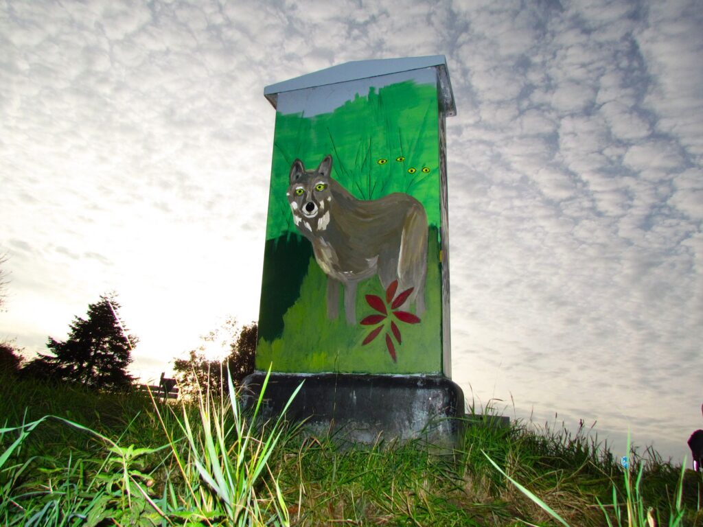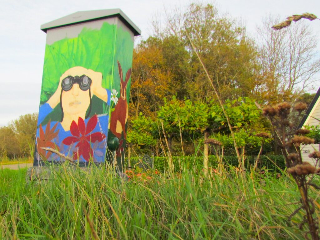 Tegelijkertijd werd er nog volop gebruik gemaakt van de nog behoorlijk droge en aangename dagen in november. Cathy van der Meulen heeft nu het record van Michael Glanz overgenomen. Nog niet eerder werd er zo laat in het jaar nog geschilderd. De vijfde kunstkast van Cathy is een remake van haar eerste kunstkast, die negen jaar lang volop in de zon langs de drukke Bachlaan heeft gestaan. Die was echt aan een opknapbeurt toe. Leuk om te zien dat het concept intact is gebleven, maar de uitvoering is veranderd. De kunstkast staat op wandelroute ‘het Pelgrimspad’. Daarom staan nog steeds de ontdekkingen van een wandelaar centraal. Met verrekijker worden een uil, een haas en een wolf gespot.
