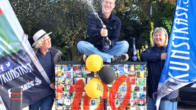 Aalsmeer – Tien jaar geleden werden de eerste kunstkasten op het Praamplein onthuld door Gertjan van der Hoeven, de toenmalige wethouder in Aalsmeer. In dit jubileumjaar is nu, na heel veel schilder- en plakwerk, de honderdste kunstkast gemaakt! Dubbel feest dus en een prachtige mijlpaal voor Giovanni, Jolande en Lex van de kunstkastorganisatie. Romeo van der Weijden ontwierp de speciale jubileumkast op de Machineweg. Er is een collage op te zien van alle kunstkasten van de afgelopen tien jaar.