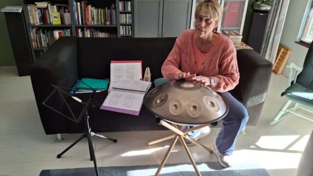 “Dat is de handpan. Dit is een metalen muziekinstrument dat je met je handen bespeelt. Het werd ontwikkeld begin 2000, afgeleid van de steeldrum en de ghatam. De vorm lijkt wel wat op een UFO en elk instrument bevat zorgvuldig gestemde toonvelden. Je bespeelt het door met je vingers of handpalmen te tikken. De handpan produceert warme, etherische klanken. Je kunt er ritme en melodie op combineren. Drie jaar geleden ben ik daar mee begonnen. Mijn zus had er een gekocht en ik leende die van haar en ik was meteen verkocht. Het is mijn favoriete instrument. Het ontspant me.”