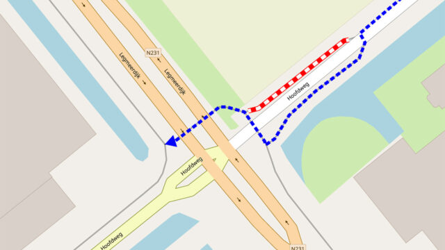 De Kwakel – De provincie Noord-Holland werkt van vrijdag 6 februari 20.00 uur tot maandag 9 februari 05.00 uur aan de verkeerslichten op de kruising van de Legmeerdijk (N231) en Hoofdweg in De Kwakel. Onderdelen van de verkeerslichten op de kruising worden vervangen. Tijdens de werkzaamheden worden de verkeerslichten uitgeschakeld. Tijdens de werkzaamheden zijn op de Legmeerdijk (N231) ter hoogte van de kruising minder rijstroken beschikbaar. Op de kruising begeleiden verkeersregelaars het verkeer. Alle richtingen van de kruising blijven beschikbaar. Fietsers kunnen onder begeleiding van de verkeersregelaars en via een korte omleiding op de Hoofdweg de kruising oversteken, zie de blauw gestippelde lijn op de kaart.