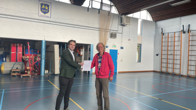 Baambrugge – Dorpshuis De Vijf Bogen en gemeente De Ronde Venen hebben een aantal concrete afspraken gemaakt over het opknappen en verduurzamen van de gymzaal. Afgelopen 13 oktober hebben voorzitter Anco Boonstra van het bestuur van het dorpshuis en wethouder Cees van Uden hun handtekening onder de afspraken gezet. Daarin staat onder meer, dat de gemeente het opknappen en verduurzamen van de gymzaal financieel ondersteunt. De ondertekening betekent, dat de voorbereiding van het werk nu daadwerkelijk kan beginnen.