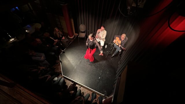 Aalsmeer – Dat ook een klein aantal mensen het publiek in vervoering kan brengen, bewees het drietal Spaanse artiesten wel, dat vrijdag 31 oktober te gast was in Cultureel Café Bacchus in Aalsmeer. Op het podium van de kleine zaal gaven gitarist Yorgos Valiris, zanger Juan Penas en danseres Romina Toroz een flamenco concert waar de vonken vanaf vlogen. De uitvoering van flamenco dans, zang en gitaar was zo goed in balans en er ging zoveel passie vanuit dat het publiek ademloos zat te luisteren en kijken. ‘Zat’, aangezien het concert ‘seated’ was en ook uitverkocht was tot de laatste stoel. Ook zittend viel er veel te genieten van de flamenco, een stijl op muziek- en dansgebied die echt bij de Spaanse cultuur hoort en die je in Aalsmeer niet heel vaak op het podium tegenkomt. De vurige en passionele klanken van zanger Juan Penas zijn behoorlijk in tegenstelling met de nuchterheid van de meeste Aalsmeerders, maar vrijdagavond was daar niets van te merken: een dik applaus was zijn deel. De behendige en getalenteerde gitarist Yorgos zorgde voor zijn vingervlugge snaarwerk inderdaad voor een gevoelige snaar. In het ‘kleine’ Bacchus zitten de bezoekers bijna ‘bovenop’ de muzikanten en zo konden zij het gitaarspel van Yorgos goed volgen. Maar eigenlijk is de term ‘onnavolgbaar goed’ hier beter op zijn plaats. Voor de Aalsmeerse gitarist werd dan ook hard geklapt. Mooi van de flamenco is dat het klappen een onderdeel is van deze dans/zang. De prachtig geklede Romina Toroz maakte de Spaanse avond compleet, met veel pit en elegantie presenteerde zij de flamenco dans in optima forma!