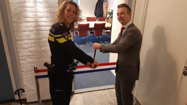 Aalsmeer – Maandag 6 januari even over negen uur in de ochtend heeft burgemeester Gido Oude Kotte de nieuwe politiepost in het gemeentehuis geopend. Samen met wijkteamchef Gabriëlle Rondaij knipte hij met een grote schaar het lint voor de toegangsdeur open.