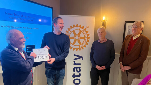 Abcoude – Rotaryclub Vinkeveen-Abcoude overhandigde maandag 3 november een cheque van 500 euro aan de Abcouder Harmonie. In het kader van haar 125-jarig jubileum organiseerde de Abcouder Harmonie dit jaar het Nieuw Talent Orkest Abcoude in samenwerking met de stichting Mear mei muzyk (Meer met muziek) van Annewiep Bloem en Guus Pieksma, de bedenkers van dit concept.