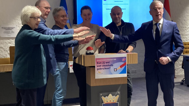Op de foto: De lancering van stemhulpen met kandidaten Marga Moeijes (PvdA), Nico Tijsterman (CDA), Alexander Reuvekamp (VVD), Petra van Leeuwen (Gemeetebelangen), José de Robles (DUS!) en burgemeester Pieter Heiliegers. Foto: aangeleverd.