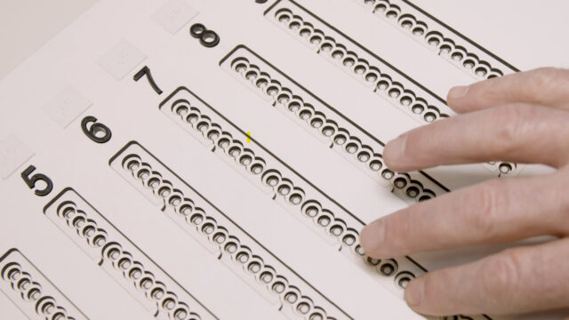 Het stembiljet wordt in de mal gelegd, waarna de kiezer via voelbare markeringen en audio-ondersteuning van een soundbox precies kan bepalen waar de gewenste kandidaat staat en het juiste vakje rood kan kleuren.