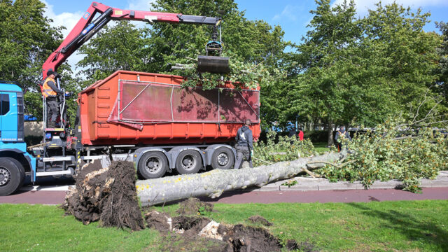 Omdat het een drukke straat en bus route betreft kwamen de mannen van de gemeentewerf bij het eerste telefoontje snel in actie. Wegafzetting en een omleiding werden direct geregeld en even later kwam een grote wagen met laadkraan ter plaatse. De zaagploeg zorgde ervoor dat de grote boom in stukken van enkele meters werd doorgehaald die makkelijk konden worden opgehesen en in de containerwagen afgevoerd. Ongeveer drie kwartier na de eerste melding was alles aangeveegd en kon iedereen er weer langs, ook de bus.
