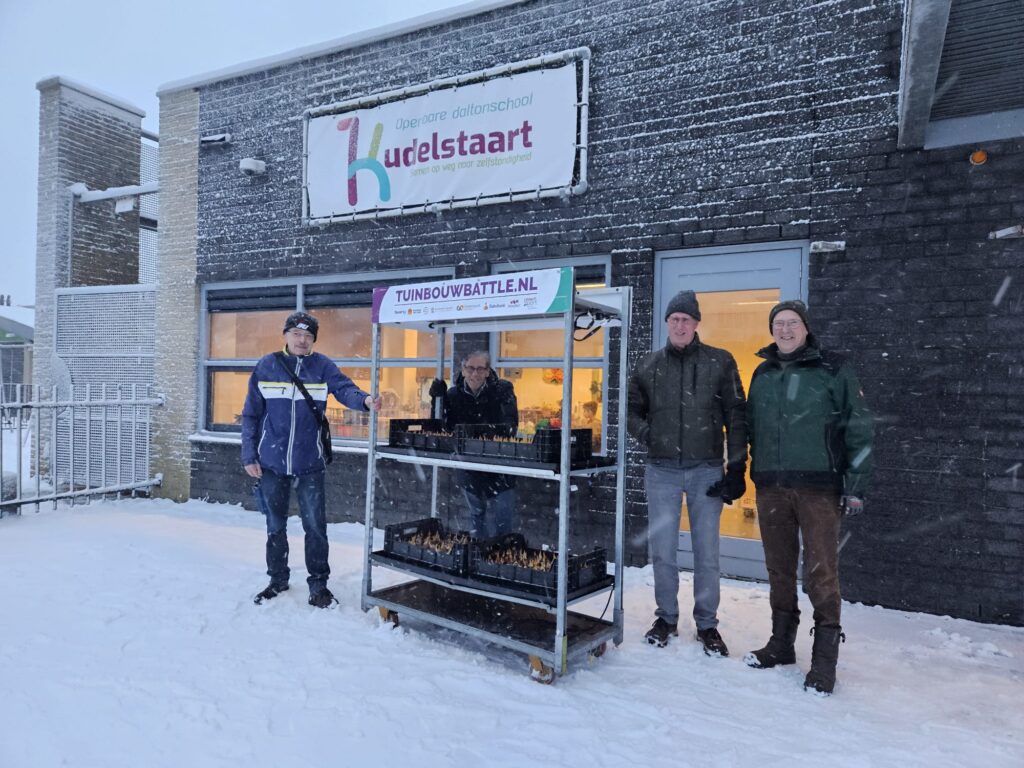 Aalsmeer – Op woensdag 7 januari is er nieuwe ronde gestart van de Tuinbouw Battle. Dit keer doen er naast de basisscholen ook leerlingen van een niet-groene vmbo mee. Zo’n 125 leerlingen gaan de komende weken zelf tulpen kweken, oogsten en verkopen. Wethouder Bart Kabout van de gemeente Aalsmeer nam een kijkje bij OBS Kudelstaart, waar de leerlingen de kar enthousiast in ontvangst namen.