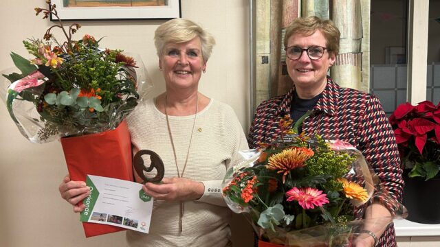 Aalsmeer – Na afloop van de najaarsvergadering met dertig vrijwilligers van De Zonnebloem afdeling Aalsmeer-Rijsenhout werden twee jubilarissen in het zonnetje gezet. Ria Eling en Ingrid Groeneveld zijn beiden 25 jaar vrijwilliger bij deze waardevolle vereniging. Zij zijn in 2000 gestart en hebben in 25 jaar talloze gasten bezocht en activiteiten mee helpen organiseren. Het hoofdkantoor in Breda zorgde voor een speldje en een oorkonde. Natuurlijk kregen Ria en Ingrid ook nog een mooi boeket overhandigd. Omdat Ingrid stopt met haar werk voor De Zonnebloem, kreeg zij ook een prachtig beeldje cadeau, wat heel goed de verbinding symboliseert tussen vrijwilliger en gast van De Zonnebloem. Natuurlijk werd daarna het glas geheven op hen.
