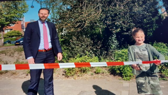 Aalsmeer – Vrijdag 24 april heeft Vera samen met wethouder Robert van Rijn officieel het zebrapad aan de Ophelialaan in gebruik genomen. Dit deed zij door een lint door te knippen.