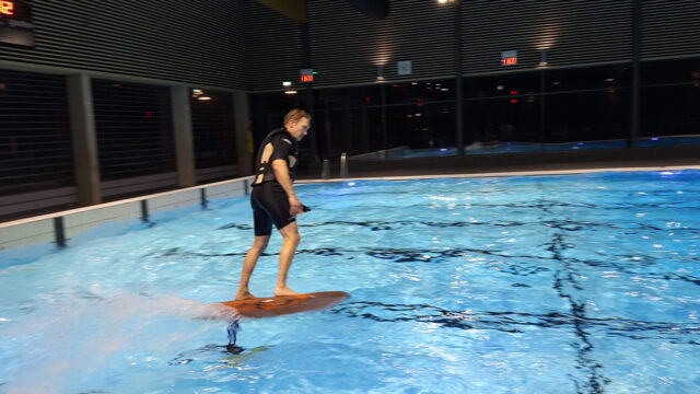 Mijdrecht – Geen zwemmers die baantjes trekken of een groep die zwemles volgt, maar een e-foil die over het diepe van het Veenweidebad in Mijdrecht scheert. De test van deze e-foil is zeer succesvol. Het board komt bij snelheid uit het water, gedragen door de frontwing die scholier Esmee de Groot heeft ontworpen en gebouwd.
