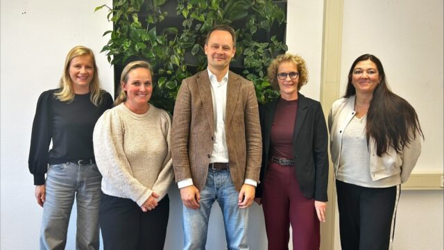 Foto: V.l.n.r.: Mariska Veenstra-Buist (manager VE-kinderopvang Partou), Anne-Lot Weerd (locatieleider Partou Aalsmeer), Bart Kabout (wethouder onderwijs), Dita van Dijk (directeur-bestuurder Solidoe Kinderopvang) en Carlijn van Gils (manager Pedagogiek Solidoe Kinderopvang. Foto: Gemeente.