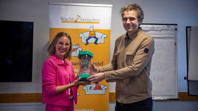 Tijdens een startbijeenkomst voor welzijnswerkers, Wmo-consulenten en samenwerkingspartners kreeg wethouder Cees van Uden een grote zandloper overhandigd. Deze zandloper staat symbool voor de lange wachttijden in de geestelijke gezondheidszorg. Lotte Willemsen (coördinator in De Ronde Venen) en Esther van der Meer (regiomanager) van de WachtVerzachter vertelden over het project. Met de WachtVerzachter kunnen inwoners vanaf 17 jaar en ouder tijdens de wachttijd al werken aan herstel.