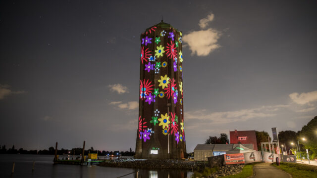Foto’s: www.kicksfotos.nl. (De lichtshow op de watertoren afgelopen zaterdag 3 september tijdens Vuur en Licht op het Water)