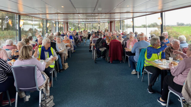 Aan boord genoten de gasten van een uitgebreide lunch en het fraaie herfstweer, dat het uitzicht op de molens en rietsloten extra bijzonder maakte. De sfeer was gemoedelijk en er werd volop genoten van het gezelschap en de rust op het water. Na afloop werden de gasten weer veilig thuisgebracht, mede dankzij de inzet van een tiental vrijwilligers. Hun hulp bij het in- en uitstappen, begeleiden en vervoer was onmisbaar voor het welslagen van deze dag.