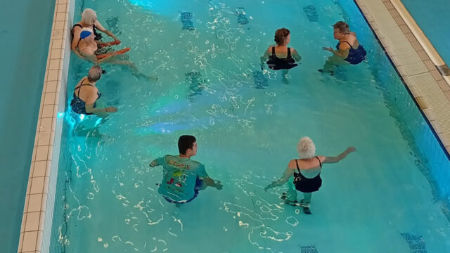 Bij aankomst bij FSC werden de deelnemers ontvangen met koffie en thee en een zelfgebakken koekje door de werknemers van FSC. Daarna begon het programma in het speciaal ingerichte zwembad. Dit is geen regulier zwembad: het water is aangenaam warm en de bodem van het bad is verstelbaar, waardoor deze kan zakken. Hierdoor konden ook deelnemers in een rolstoel veilig en comfortabel deelnemen aan de activiteiten. Het uur in het water werd begeleid door verschillende medewerkers van FSC. Deze medewerkers deden oefeningen voor en begeleidden de activiteiten, zodat iedereen op zijn of haar eigen niveau kon meedoen. Dit zorgde voor structuur, veiligheid en vertrouwen bij de deelnemers.